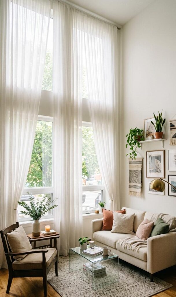 Curtains can impact how spacious your living room feels. Hang curtains higher than the window frame to create the illusion of taller ceilings. Choose light, sheer fabrics to allow natural light to flow in. This smart decor trick enhances both brightness and height perception in your room. Avoid heavy, dark curtains that can make the space feel smaller. Proper curtain placement is a simple yet effective way to upgrade your small living room decor.