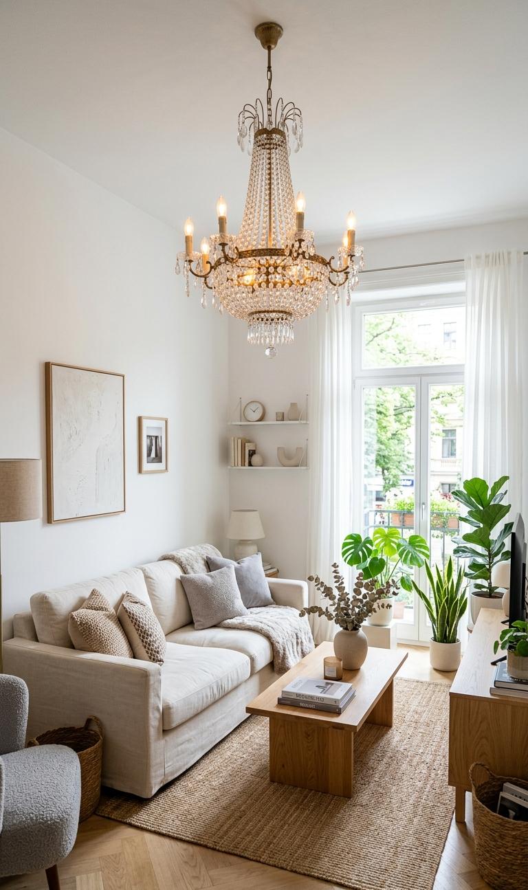 When selecting a chandelier for a small living room, scale and design are crucial. Opt for a compact yet bold chandelier that complements your decor without overwhelming the room. Modern small living room decor often features geometric or minimalist chandeliers that add sophistication while maintaining visual balance. Avoid overly bulky designs and instead choose open-frame or glass fixtures that allow light to flow freely. This enhances the perception of space and keeps the room airy. Pairing a chandelier with neutral furniture and subtle textures creates harmony and avoids visual clutter. Additionally, dimmable lighting options give you flexibility to adjust ambiance according to mood or time of day, making your living room both stylish and functional.