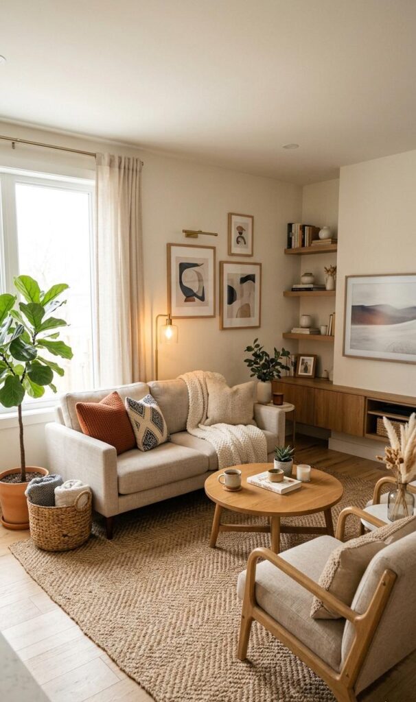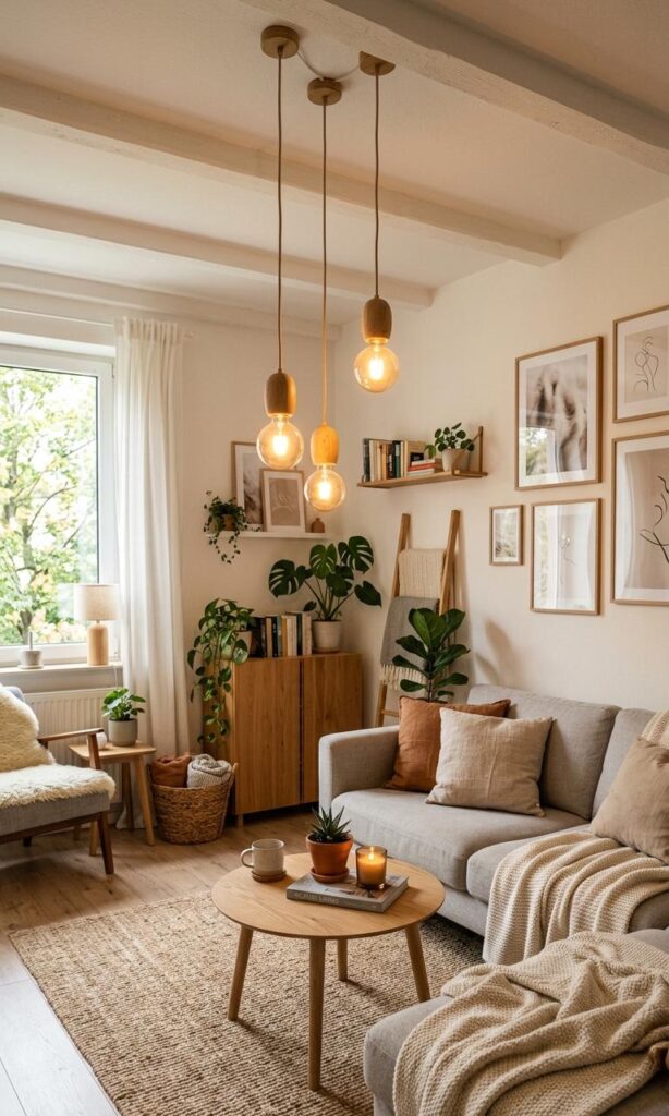 Small living room decor ideas with statement lighting are trending because they instantly elevate compact spaces without overcrowding them. A bold light fixture like a sculptural chandelier or oversized pendant becomes the focal point, drawing the eye upward and creating the illusion of height. This small living room design trend works perfectly in apartments where floor space is limited. By combining minimalist furniture with eye-catching lighting, you create a balanced look that feels both stylish and functional. Choose warm LED lighting to enhance comfort while maintaining energy efficiency. Pair your lighting with light-colored walls and reflective surfaces to amplify brightness. This approach ensures your space feels larger, more inviting, and visually dynamic without compromising on practicality or comfort.