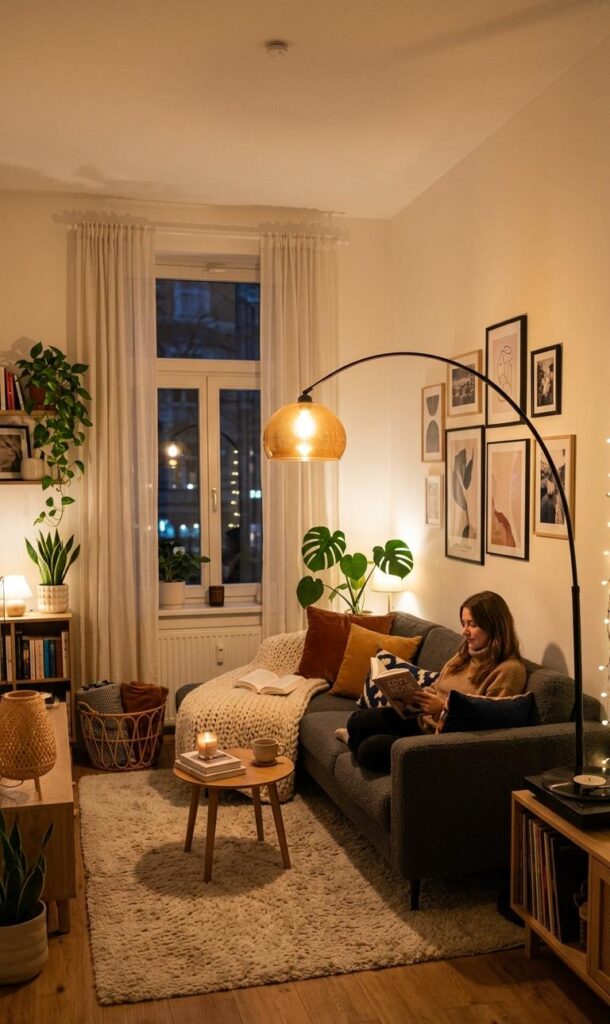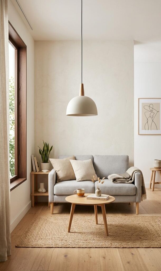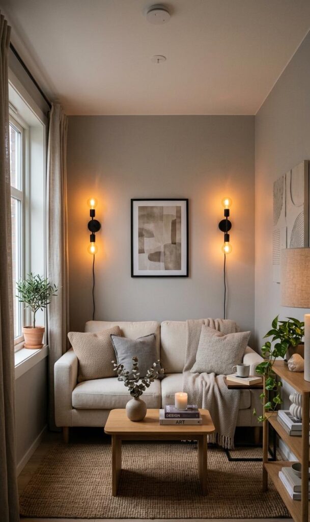 Minimalist lighting is perfect for those who prefer a clean and uncluttered look. In small living room decor ideas, simplicity often creates the most impact. Choose sleek fixtures with simple lines and neutral colors to maintain a cohesive design. A single statement light can serve as the focal point while keeping the rest of the decor understated. This approach aligns with modern minimalist home trends, where functionality and simplicity are key. Pair minimalist lighting with light furniture and subtle textures to create a calm and balanced environment that feels both stylish and comfortable.