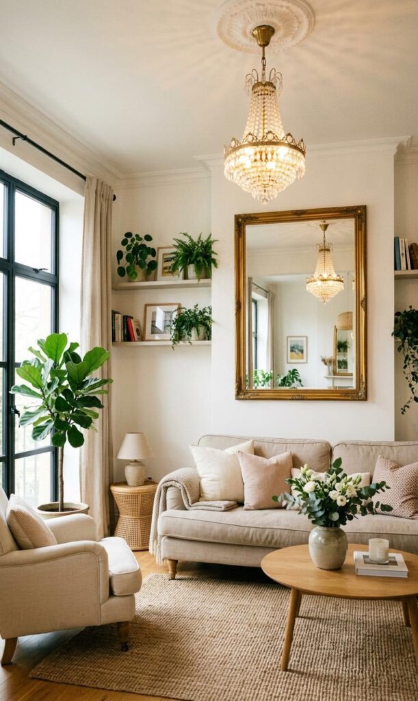 Combining mirrors with statement lighting in small living rooms is a powerful design trick. Mirrors reflect light, making the space appear larger and brighter. Position a mirror opposite your main light fixture to maximize its effect. This technique is widely used in small space interior design trends to create an illusion of openness. Choose decorative mirrors that complement your lighting style for a cohesive look. The combination of reflective surfaces and strategic lighting placement enhances both functionality and aesthetics, making your living room feel more expansive and inviting.