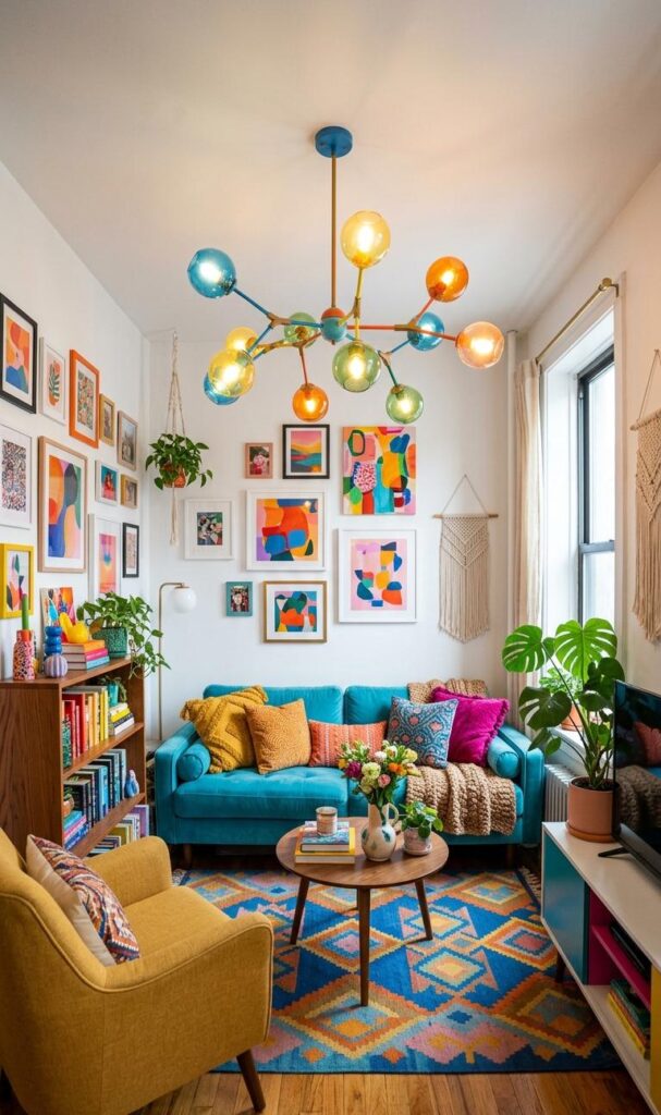 Adding color through lighting fixtures is a creative way to enhance small living room decor. Bold-colored pendant lights or chandeliers can act as a focal point, adding personality and vibrancy to the space. This trend is gaining popularity in modern interior design, where unique elements are used to express individuality. Choose colors that complement your existing decor to maintain harmony. A brightly colored light fixture can transform a neutral room into a lively and stylish space without requiring major changes.