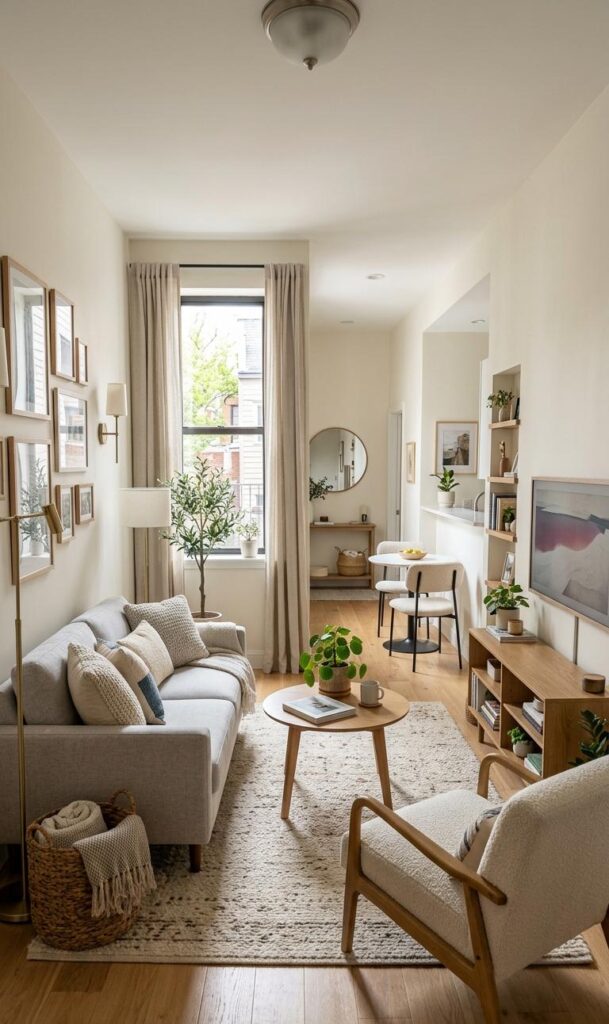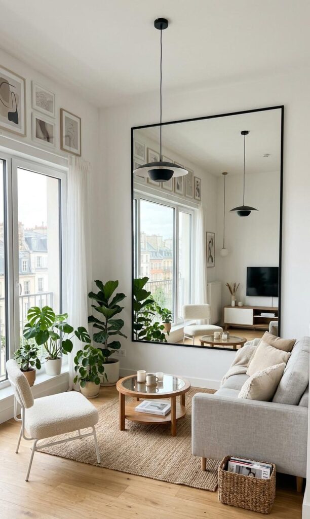 Mirrors are a timeless trick in small living room decor ideas that create the illusion of a larger space. Strategically placing a large mirror opposite a window reflects natural light, making the room feel brighter and more open. Trending styles include round mirrors, vintage frames, and floor-length designs that add elegance and depth. Mirrors also act as decorative elements, enhancing the overall aesthetic of your living room. Pair them with light-colored walls and minimal furniture to maximize their effect. This simple yet powerful design technique is widely used in modern interiors to transform compact spaces into airy environments. Incorporating mirrors ensures your small living room design remains stylish, functional, and visually expansive.