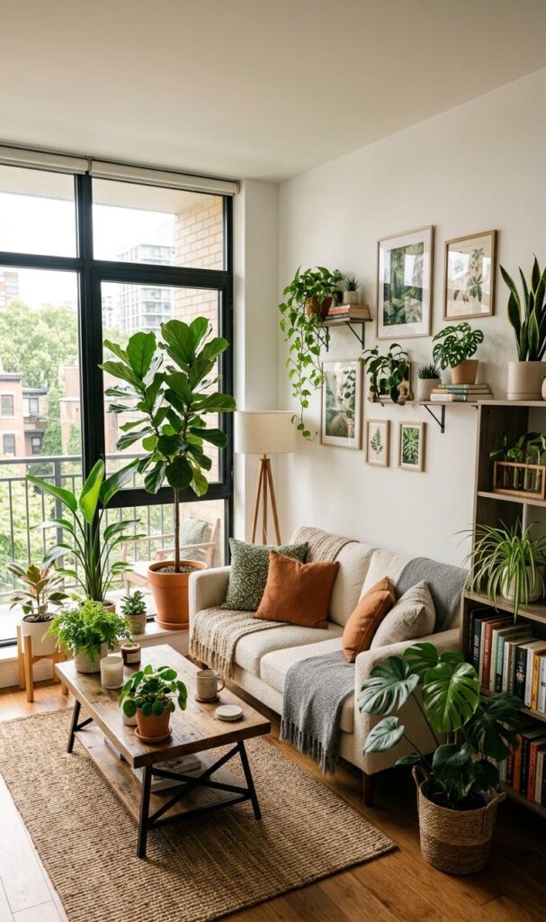 Adding greenery is one of the most refreshing small living room decor ideas. Indoor plants bring life, color, and a natural element to your space. Popular choices include snake plants, pothos, and small succulents that are easy to maintain. These plants fit perfectly in compact areas and can be placed on shelves, windowsills, or hanging planters. The trend of biophilic design emphasizes connecting interiors with nature, making it a popular choice for modern homes. Plants also improve air quality and create a calming environment. By incorporating greenery, you can achieve a unique and vibrant living room style that feels fresh, inviting, and visually appealing without overwhelming the space.