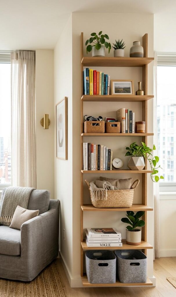 Making use of vertical space is essential in small living room ideas. Install wall-mounted shelves, floating cabinets, or tall bookcases to store items without occupying floor space. This technique keeps the room organized and visually appealing. Trending designs focus on sleek, minimal shelving that blends seamlessly with the decor. You can display books, plants, and decorative pieces to personalize your space. Vertical storage solutions not only maximize functionality but also draw the eye upward, making the room appear taller. By optimizing wall space, you can maintain a clean and spacious environment while adding a unique design element to your living room.