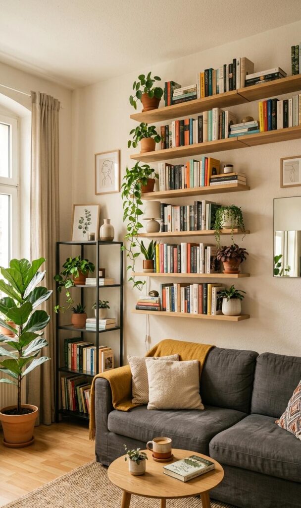 Utilizing vertical space is one of the smartest space-saving decor ideas for small living rooms. Wall-mounted shelves free up floor space while offering stylish storage for books, plants, and decor items. These shelves can be arranged creatively to enhance the room’s aesthetic while maintaining functionality. Floating shelves, in particular, are trending for their sleek and modern look. By using vertical storage, you can keep your living room organized without overcrowding it. This approach is especially helpful in compact apartments where every inch counts. Incorporating wall shelves decor also allows you to personalize your space while keeping it clutter-free. It’s a practical and visually appealing solution for modern small homes.