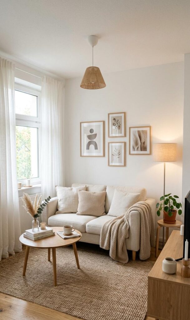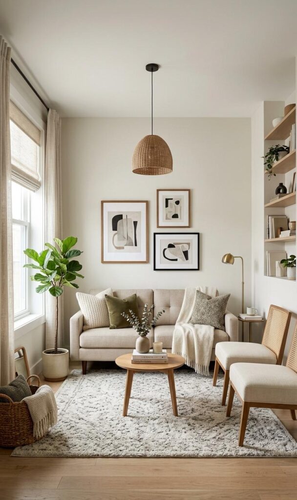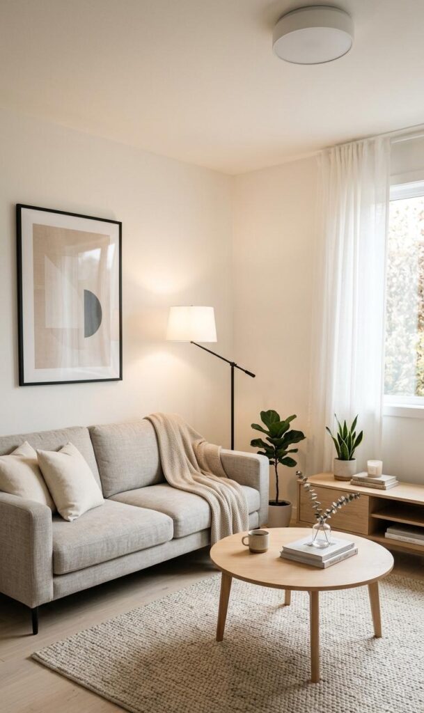 Keywords: neutral color palette, small room decor, airy living room