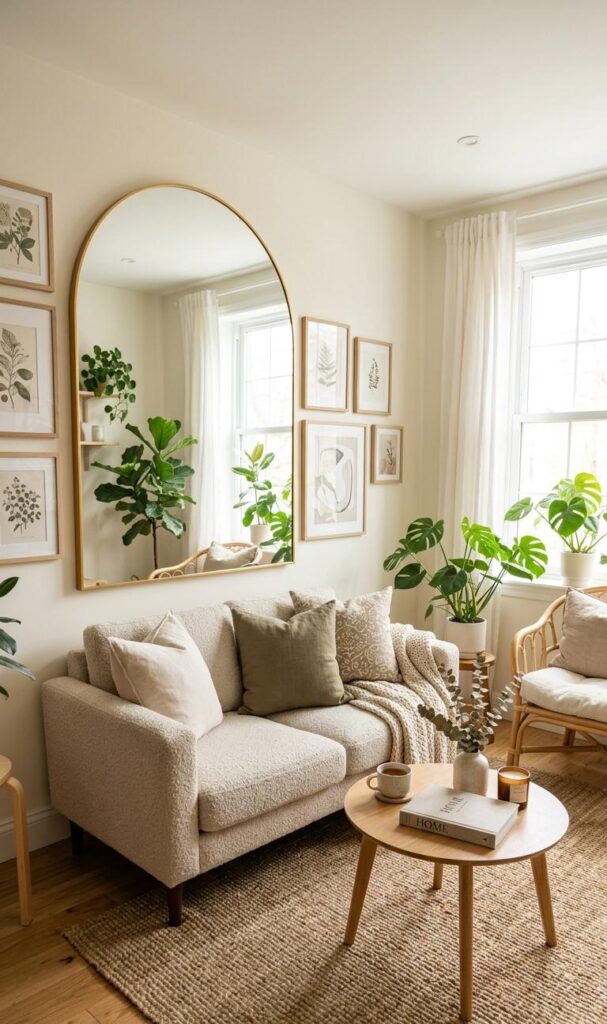 Keywords: mirror decor ideas, small space illusion, modern living room tips