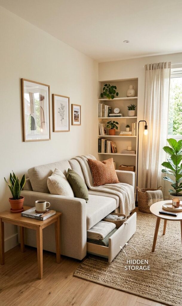 Keywords: space-saving furniture, small living room ideas, multi-functional design
