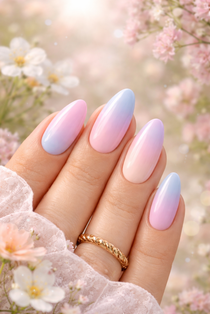 Ombre nails blending soft hues like pink to peach or lavender to blue create a dreamy gradient effect. This style feels fresh, modern, and perfect for adding subtle elegance to your seasonal outfits ideas.