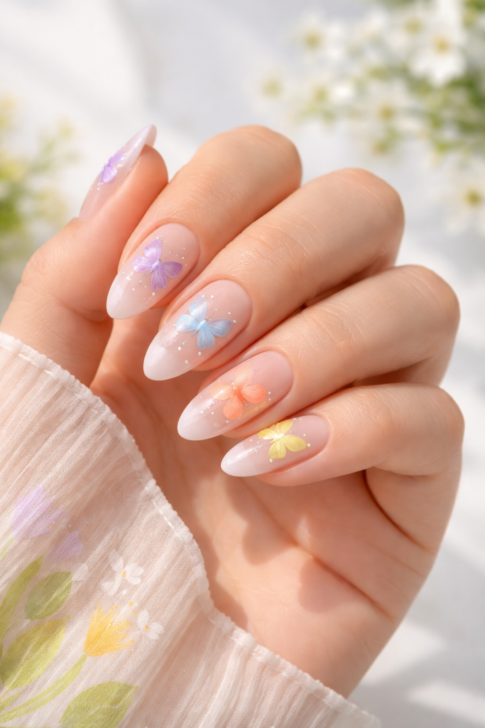 Butterflies symbolize transformation and beauty—perfect for spring. Adding small butterfly designs or decals to your nails creates a whimsical and trendy look.