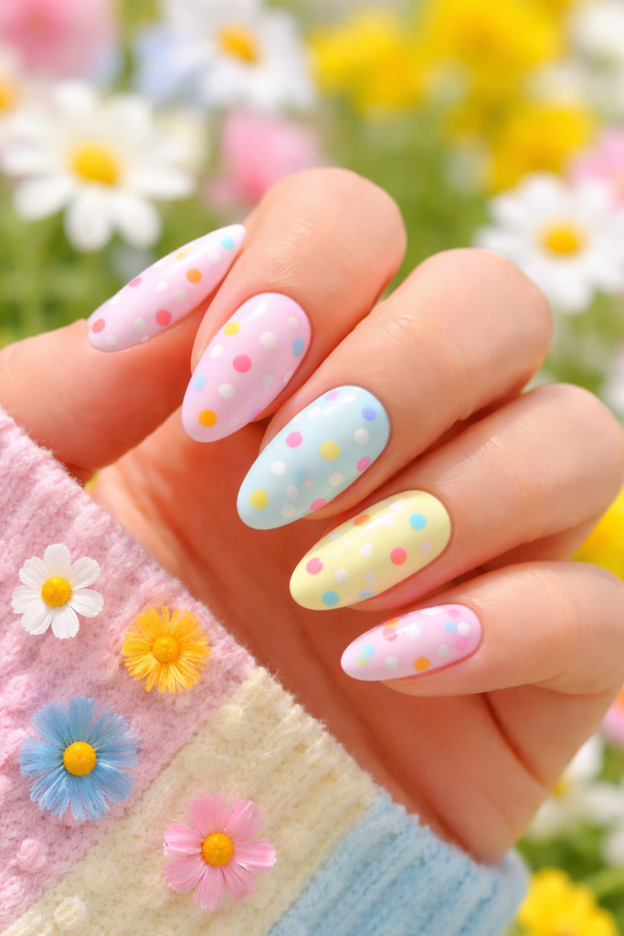 Polka dot nails are playful, cute, and easy to create. Mixing pastel bases with contrasting dots gives a cheerful and youthful vibe that fits perfectly with spring fashion.