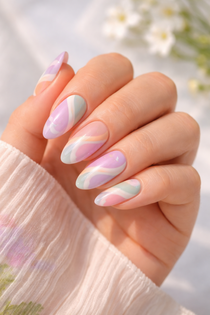 Abstract designs with swirls, lines, and color blocks are perfect for those who love unique nail art. This modern style allows you to mix different spring shades creatively.