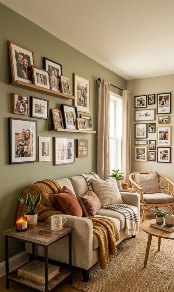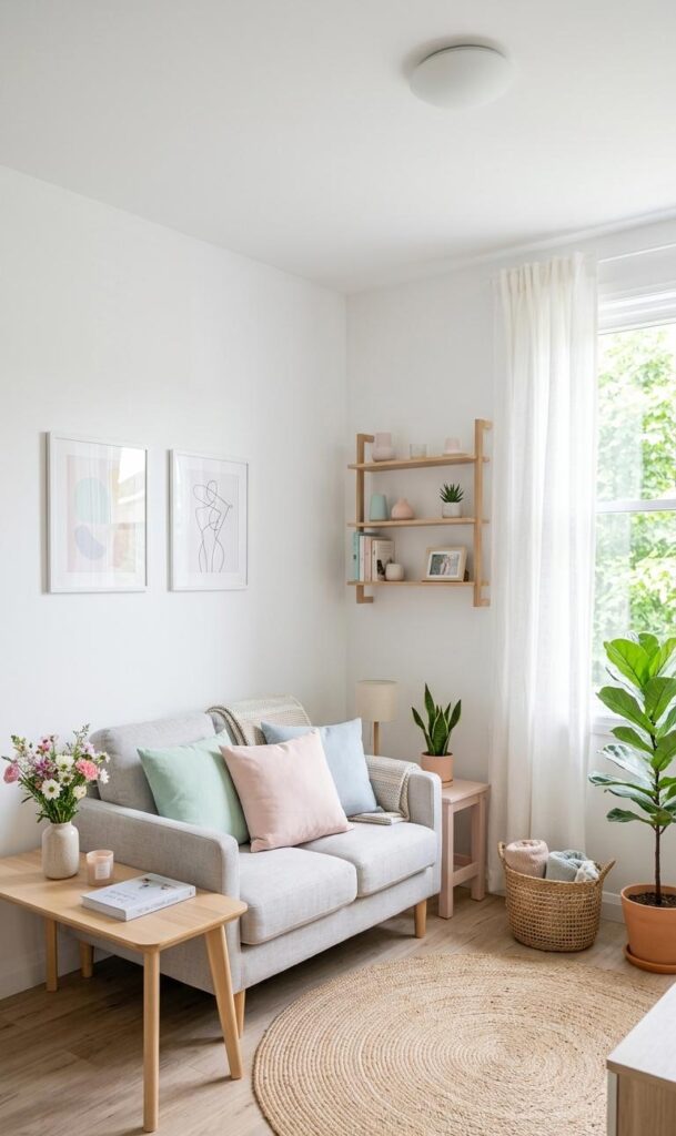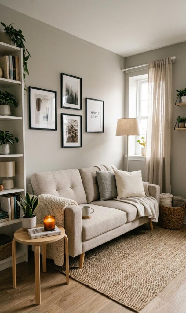 Decorating walls instead of floors is a smart approach for small spaces. Wall decor ideas like floating shelves, gallery walls, and hanging plants add personality without crowding the room. Trending keywords include wall art inspiration, floating shelves decor, and small space styling. Use shelves to display books, plants, or decorative items while keeping the floor clear. A curated gallery wall can serve as a focal point, adding visual interest and style. Opt for lightweight and minimal designs to avoid overwhelming the space. This budget-friendly technique allows you to personalize your living room while maintaining a clean, open look that feels both stylish and functional.