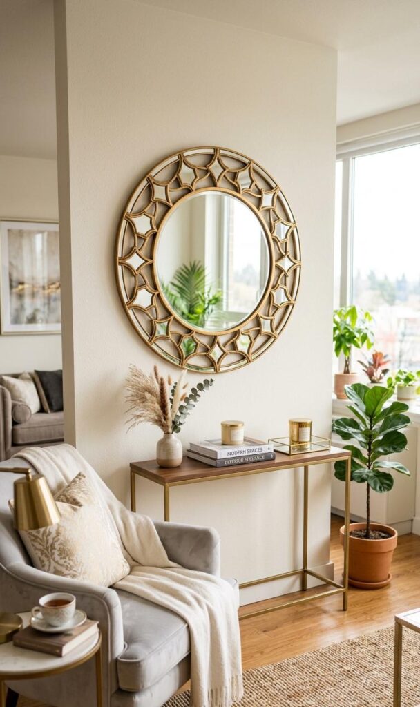 Mirrors are a powerful tool in small living room decor. Strategically placing mirrors reflects light and creates the illusion of a larger space. Trending keywords like mirror decor ideas, small space hacks, and home styling tips highlight their popularity. Position a large mirror opposite a window to maximize natural light or use multiple smaller mirrors for a decorative effect. Mirrors also add elegance and depth without taking up floor space. Choose stylish frames that complement your theme, whether modern, vintage, or minimalist. This simple and cost-effective trick instantly enhances both brightness and visual size, making it perfect for any budget-conscious home decorator looking to elevate their living room design.